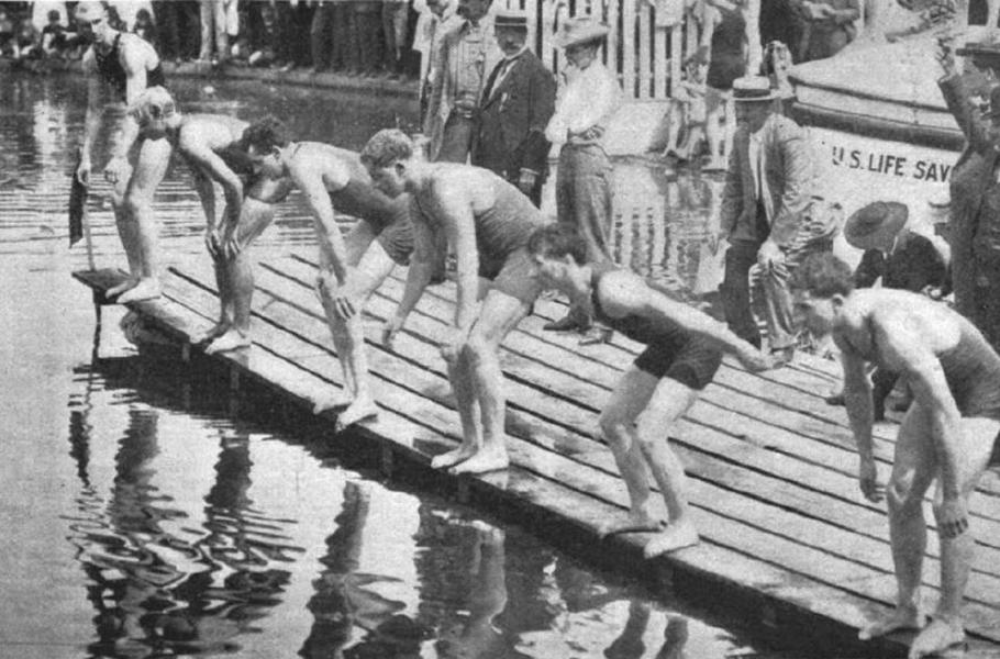 Zatímco závody motorových lodí v podobném duchu se na olympijské hry nevrátí, překážková dráha pro plavce by mohla: Jednalo se o 200 metrů dlouhou trať, na níž borci museli šplhat na tyči, přeběhnout po řadě plavidel, a nakonec celou linii lodí podplavat. Klání se účastnilo 12 plavců a nejlepší z nich si pak nezměněnou trať zopakovali. Nejrychleji ji přitom absolvoval Australan Frederic Lane, a to v čase dvě minuty a 38,4 sekundy. (foto: Wikimedia Commons, PDM 1.0)