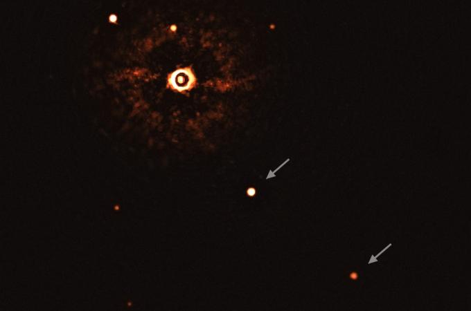 Zatím nejvíc planet se podařilo identifikovat u žlutého trpaslíka HD 10180, který se nachází ve vzdálenosti 127 ly (světelných let) v souhvězdí Hydry. V roce 2010 ohlásili astronomové objev prvních pěti oběžnic kroužících kolem zmíněné hvězdy, přičemž se jejich hmotnosti pohybují v rozmezí 13–25násobku Země. Novější pozorování uskutečněná na Evropské jižní observatoři ESO pak vedla k objevu dalších čtyř planet, z nichž největší odpovídá hmotností Saturnu a mateřskou stálici oběhne jednou za 6,3 roku. Tamní systém tudíž zahrnuje víc členek než Sluneční soustava. (ilustrace: ESO/L. Calçada, CC BY 4.0)