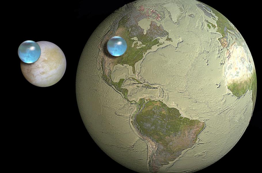 Velká pozornost se upírá k Jupiterovu měsíci Europa o průměru 3 138 km. Kosmická sonda Galileo se k němu v roce 1997 přiblížila na méně než 200 km a zjistila, že jeho ledová kůra spočívá na oceánu slané vody o hloubce až 100 km. Znamenalo by to, že rezervoár obsahuje víc než dvojnásobek vody oproti Zemi. Vzhledem ke slapovému působení obří planety a blízkých velkých měsíců se mohou na Europě nacházet podmořské sopky. Co se týká existence života, připomeňme, že na Zemi žijí kolonie organismů mimo jiné v okolí podmořských vulkanických sopouchů. A o podobné možnosti se uvažuje i v případě Jupiterova souputníka.
