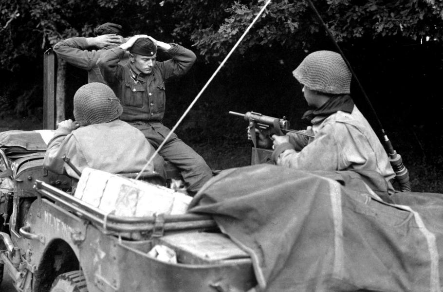 Příslušníci americké 6. pěší divize vyzbrojení samopalem M3 vezou do zajetí dvojici německých vojáků. (foto: Wikimedia Commons, NARA, PDM 1.0)