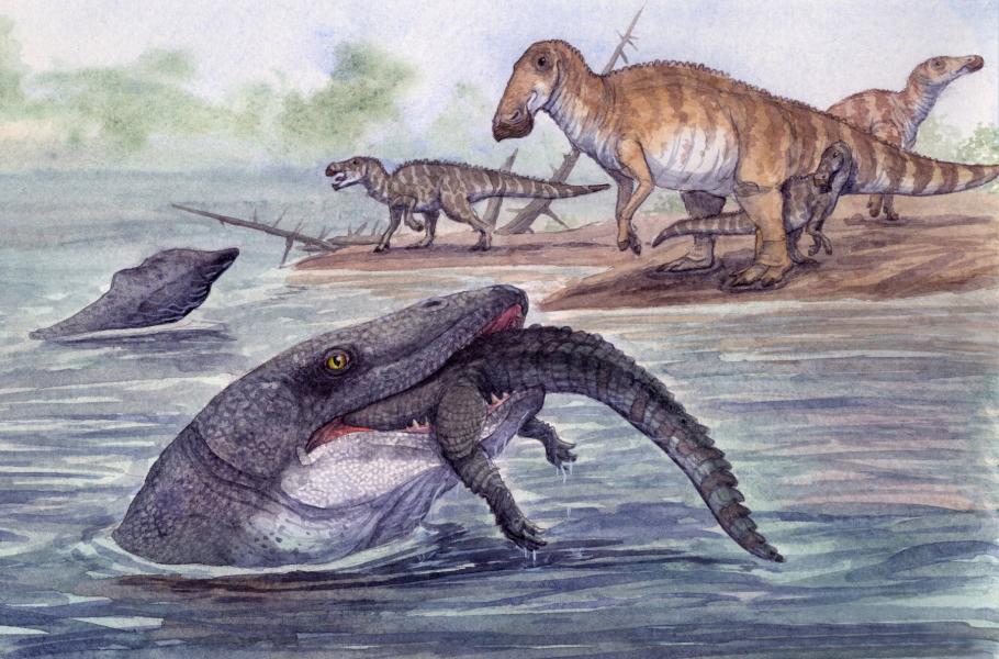 Na první pohled šlo o velmi neobvyklou kombinaci. Jak se mohla dostat na jedno místo fosilie suchozemského dravého dinosaura, krokodýla, který žil v řekách a mosasaura, o nichž vědci předpokládali, že žili v moři? Zapeklitou záhadu zřejmě rozřešil mezinárodní vědecký tým, který prozkoumal izotopy ve sklovině zubu dotyčného mosasaura.