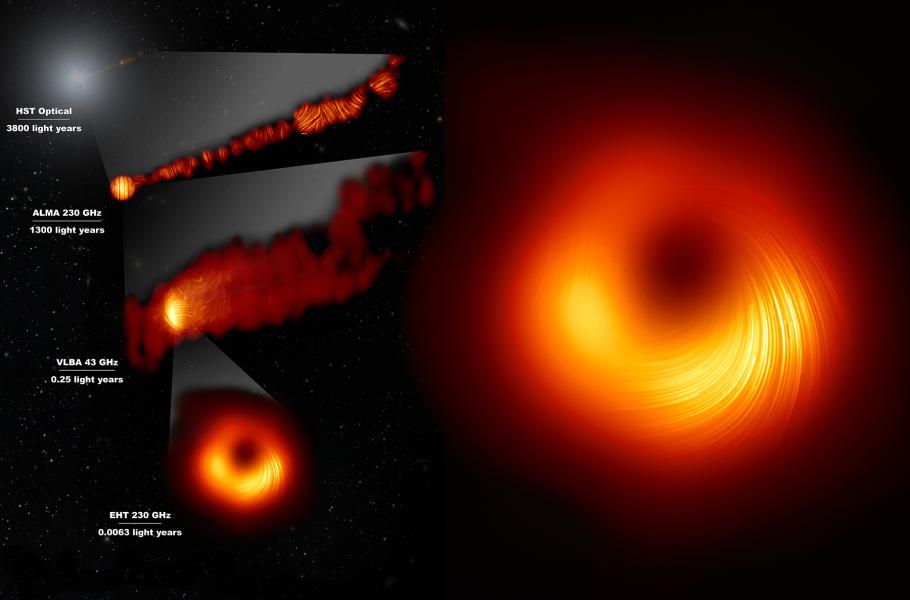 Snímek zachycuje okolí černé díry v centru galaxie M87 v polarizovaném záření. Jednotlivé čáry znázorňují orientaci polarizace, která má přímou souvislost s magnetickým polem v okolí stínu černé díry. Vlevo pohled na galaxii M87, její výtrysk a černou díru ve viditelném světle a polarizovaném záření