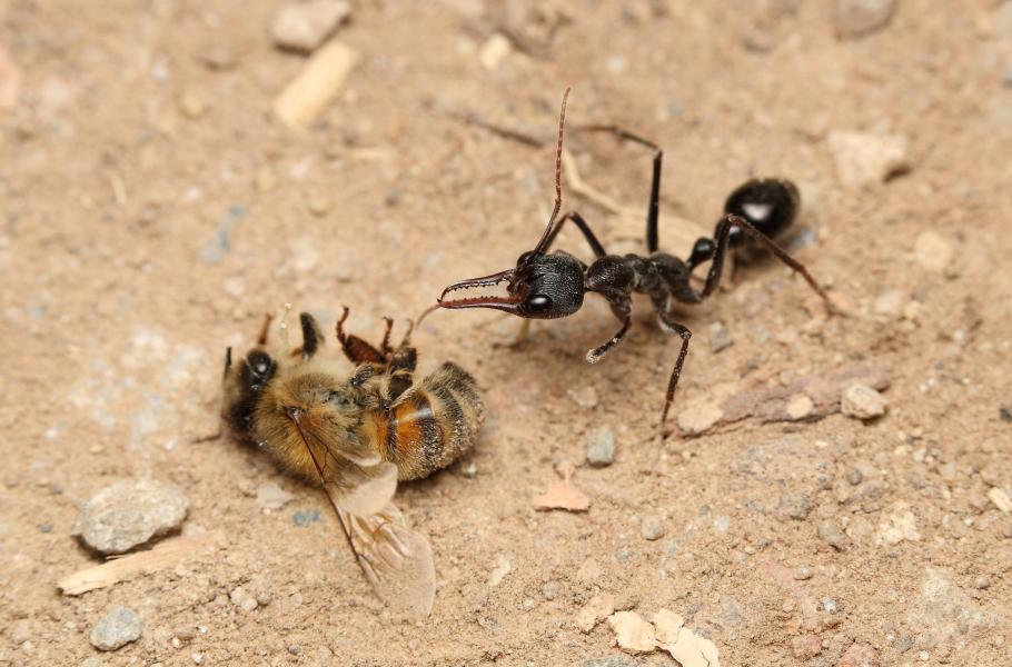 Jeden z největších druhů australských mravenců, buldočí mravenec druhu Myrmecia pyriformis s ulovenou včelou. Mravenci svou kořist nejprve sevřou svými mohutnými kusadly a po té jí uštědří smrtící žihadlo.