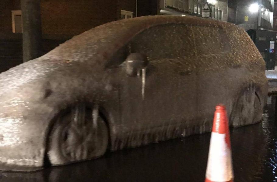 Kombinace nízkých teplot a mrznoucího deště dokáže na karoserii auta vyprodukovat pořádnou neplechu. Když se k tomu přidá i prasklé vodovodní potrubí, je o zábavu postaráno takřka s jistotou. Vůz zaparkovaný v londýnské části Tower Hamlets tak během několika hodin pokryl dokonalý ledový sarkofág.
