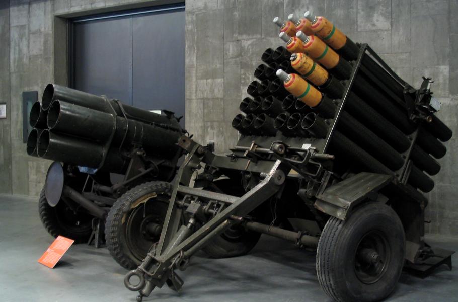 Na snímku z Kanadského válečného muzea je britský raketomet Land Mattress a za ním německý raketomet 21-cm Nebelwerfer (foto: Wikimedia Commons, Mzajac, CC BY-SA 2.5)