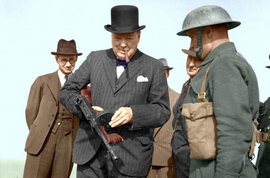 Legendární snímek britského ministerského předsedy Winstona Churchilla, kterak si prohlíží samopal Thompson, vznikl 21. července 1940 poblíž města Hartlepool během premiérovy inspekční cesty po obranných postaveních na pobřeží Albionu. Je přitom zajímavé, že záběr použili k propagandistickým účelům jak Britové, tak i Němci. V prvním případě bylo z obrázku pouze vyretušováno několik vojáků, aby Churchill vypadal více státnicky a majestátně.