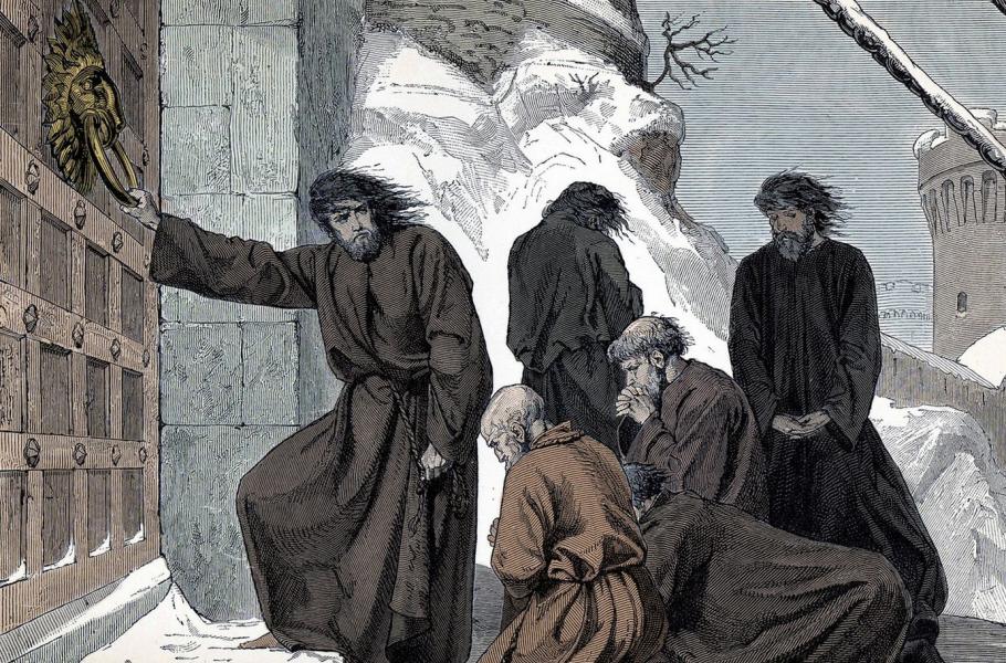 Jindřich IV. v prostém rouchu čeká před hradem Canossa, až ho papež přijme. Čekal v lednovém počasí venku tři dny. (ilustrace: Wikimedia Commons, PDM 1.0)
