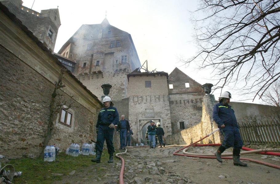 „Prokletí“ 15. dubna se nevyhnulo ani Česku. Právě v tento den roku 2005 zachvátily plameny hradu Pernštejn. Na záchraně kulturní památky se podílelo 23 profesionálních a dobrovolných jednotek s více než 120 hasiči z kraje Jihomoravského a Vysočina. Přesnou příčinu vzniku požáru se nepodařilo zjistit. Z pracovních verzí je nejpravděpodobnější chemické samovznícení způsobené zatečením laku (po lakování a broušení dřevěné podlahy) do prachových podílů a obilných plev pod podlahou 1. nadzemního patra. Přímá škoda způsobená požárem byla vyčíslena na 100 milionů korun. Škodu na předmětech v mobiliáři lze však jen velmi těžko vyčíslit, protože ztráta některých historických předmětů či stavebních prvků je nenahraditelná. (foto: Profimedia, Radek Miča)