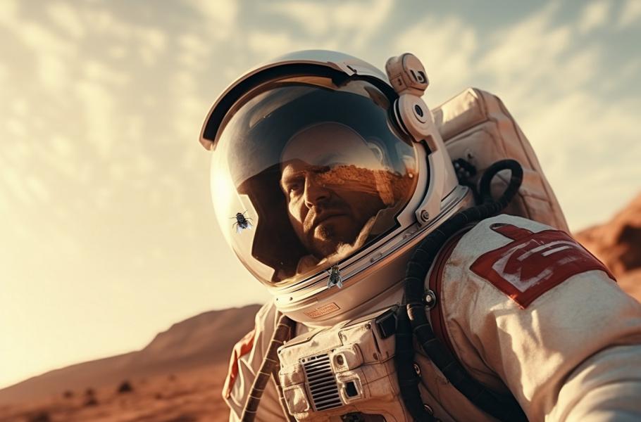 Pokud budou chtít astronauté žít delší dobu na povrchu Marsu, nevystačí si jen s dovezenými zásobami. Zúrodnit marsovský regolit by jim mohl pomoci hmyz. (ilustrace: Midjourney AI, PDM 1.0)