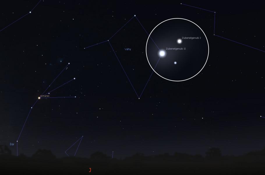 Kam ale na nebi zamířit za vlahého podvečera, kdy je pohled do vesmíru nejpříjemnější? Nabízí se třeba souhvězdí Vah, v první polovině noci tedy jihozápadní obzor. Nejsnazší je vydat se od nápadné hvězdy Spica z Panny směrem doleva, kde narazíte na druhou nejjasnější stálici Vah s obtížně vyslovitelným jménem Zubenelgenubi. Původ pojmenování je třeba hledat v arabském označení hvězdy, jež znělo „az-zubaná al-janúbí“, tedy „jižní klepeto“. A čí? Jen se rozhlédněte po okolí: Hned vedle Vah najdete souhvězdí Štíra, a právě do něj stálice v minulosti patřila.