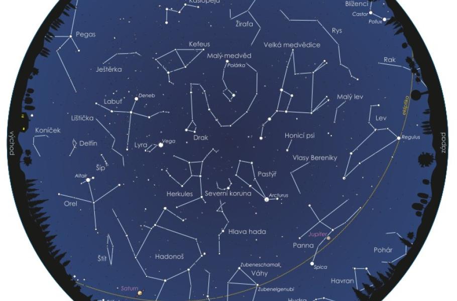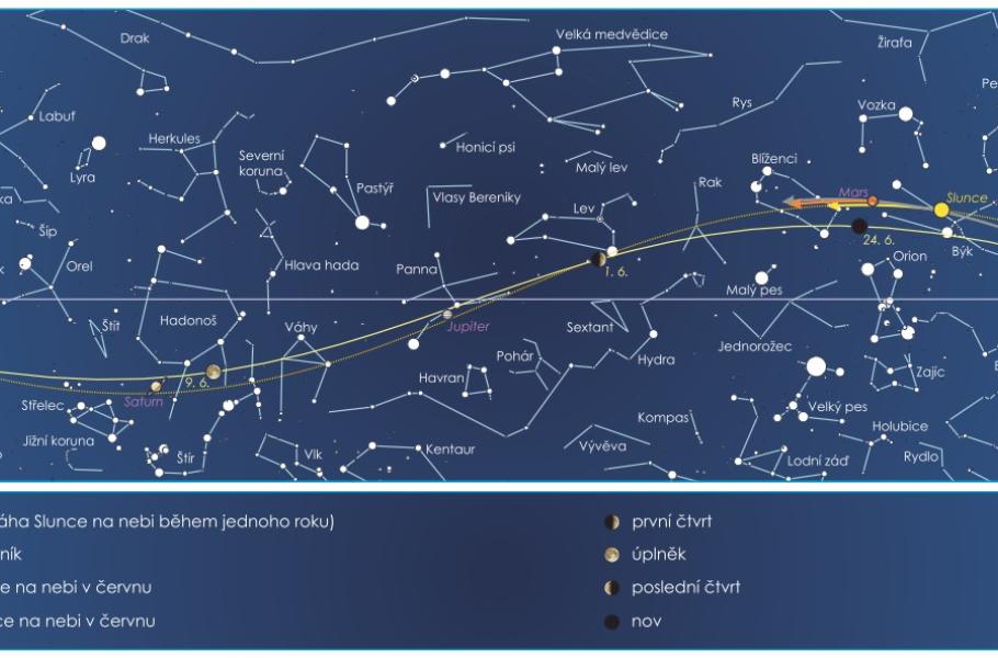 Červen je měsícem nejkratších a nejsvětlejších nocí v roce a také měsícem letního slunovratu. Ten letošní nastane 21. června v 6:24 SELČ, kdy Slunce vstoupí do znamení Raka a začne astronomické léto. Čekání na alespoň trochu tmavé hvězdné nebe se v tomto období protáhne až k půlnoci. Mezitím ozdobí oblohu několik nápadných stálic – Spica ze souhvězdí Panny, Arcturus z Pastýře, Antares ze Štíra, Vega z Lyry, Altair z Orla nebo Deneb z Labutě.