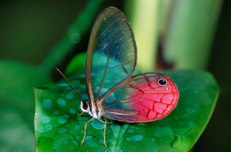 Běžným motýlům obvykle pomáhá ke splynutí s prostředím zbarvení jejich křídel. Okrasu Grety oto však tvoří materiál, který jen velmi omezeně pohlcuje světlo, minimálně jej rozptyluje i odráží. Křídla tak působí průhledně, či přímo „děravě“. Kromě kamufláže se motýl útočníkům brání pomocí jedu: Housenky i dospělí jedinci totiž přijímají toxiny z kladivníků a hvězdnicovitých, což jim propůjčuje chuť, která predátory odpuzuje. (foto: Profimedia)