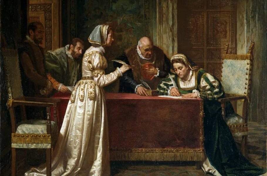 Podpis míru z Cambrai Luisou Savojskou a Markétou Rakouskou. (ilustrace: Wikimedia Commons, Francisco Jover y Casanova, CC0)