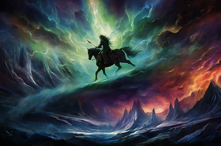 K nejdramatičtějším příběhům o polární záři patří ty ze severské mytologie. Vikingové tajuplná světla oslavovali, protože věřili, že je vytvářejí jejich bohové. Podle mýtu o „divokém jezdci“ se za temných zimních nocí po obloze proháněl Ódin na ohnivém koni v čele vojska a děsil obyčejné smrtelníky. Podle jiného příběhu vznikala polární záře při bojích mezi Ódinovým synem Thorem a mrazivými obry, nepřáteli bohů. Pokud bylo světlo vidět na jižní obloze, jednalo se o dech Thora a jeho dvou beranů, pokud ho lidé spatřili na severu, byl to dech obrů. Také se říkalo, že když svítí polární záře, nejvyšší božstva se zlobí.