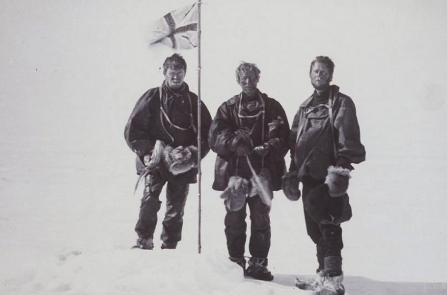 Úplně vlevo na snímku Douglas Mawson u jižního magnetického pólu. Fotografie vznikla během úspěšné výpravy v roce 1909. (foto: Wikimedia Commons, CC0)