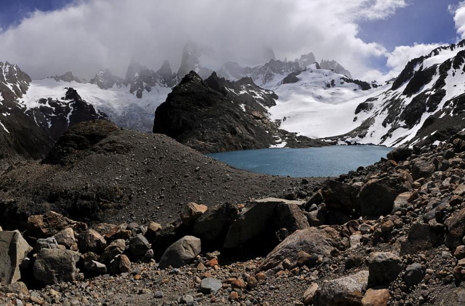 Zatímco obyvatele lesa můžete vidět skoro za každého počasí, hory se ukážou jen občas. O to krásnější je však pohled na masiv Fitz Roy od jezera Laguna Capri, nebo od výše položeného plesa Laguna de los Tres, které obklopují už jen skály a zasněžené svahy. Jedním z nich stoupá pod stěnu dvojice horolezců. Horské divadlo ale rychle končí: štíty se skrývají do oblak a z oblohy padá drobný hustý sníh. Kouřící hora se už dnes ani zítra neukáže – v Patagonii se každý naučí těšit se i z krátkého pohledu na scenérie, které jsou častěji zahalené, než odkryté.