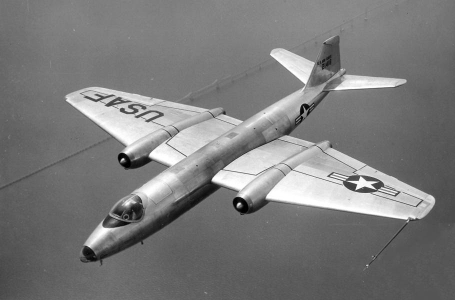 Když v létě 1950 vypukla válka v Koreji, tvořily základ taktických bombardovacích jednotek amerického letectva stále ještě druhoválečné Douglasy A-26 Invader. Koncem podzimu toho roku se ale nad bojištěm objevily sovětské stíhací MiG-15 a s americkou vzdušnou převahou byl konec. V únoru 1951 proto proběhla soutěž na nový dvoumotorový bombardér, kterého se účastnila i britská Canberra B.Mk.2, kterou při testech opět pilotoval druhoválečný hrdina Roland Beamont. Stala se přesvědčivým vítězem a společnost Glenn L. Martin Company brzy dostala zakázku na výrobu 250 kusů. Šlo o vůbec první britský bojový letoun licenčně vyráběný v USA.
