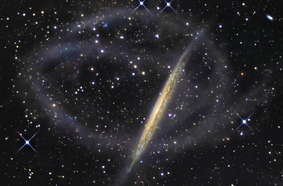 Hloubkový snímek galaxie NGC 5907 odhaluje dlouhé slapové proudy hvězd, které z této galaxie vystupují až do vzdálenosti přes 150 000 světelných let. Tyto proudy jsou pozůstatkem trpasličí galaxie, která se před 4 miliardami let s NGC 5907 sloučila. (foto: Wikimedia Commons, R. Jay GaBany, CC BY-SA 3.0)