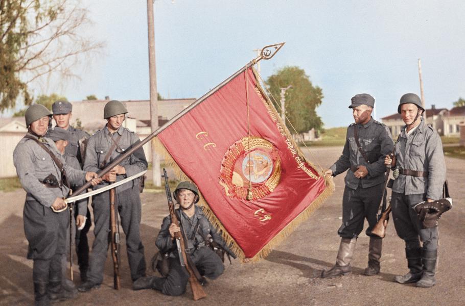 Finští vojáci pózují se sovětským praporem, který se stal jejich kořistí po znovudobytí města Sortavala dne 15. srpna 1941. V horní části vlajky je v azbuce nápis „Proletáři všech zemí, spojte se!“ a uprostřed se nachází státní znak Sovětského svazu doplněný o písmena SSSR.