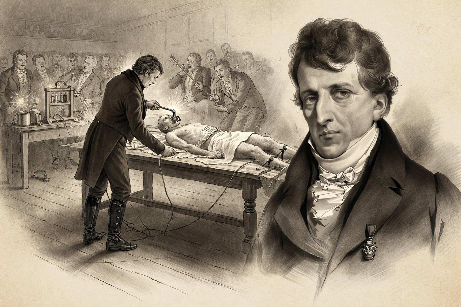 •  Giovanni Aldini své bizarní pokusy předváděl před širokým publikem po celé Evropě. (ilustrace: Chat GPT, PDM 1.0)