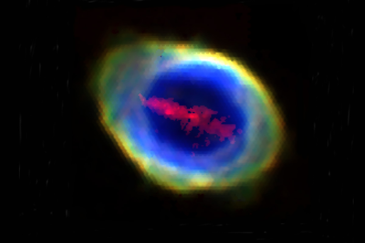 Kompozitní snímek Prstencové mlhoviny s objeveným mračnem železa. (foto: University College London, CC BY-SA 4.0)