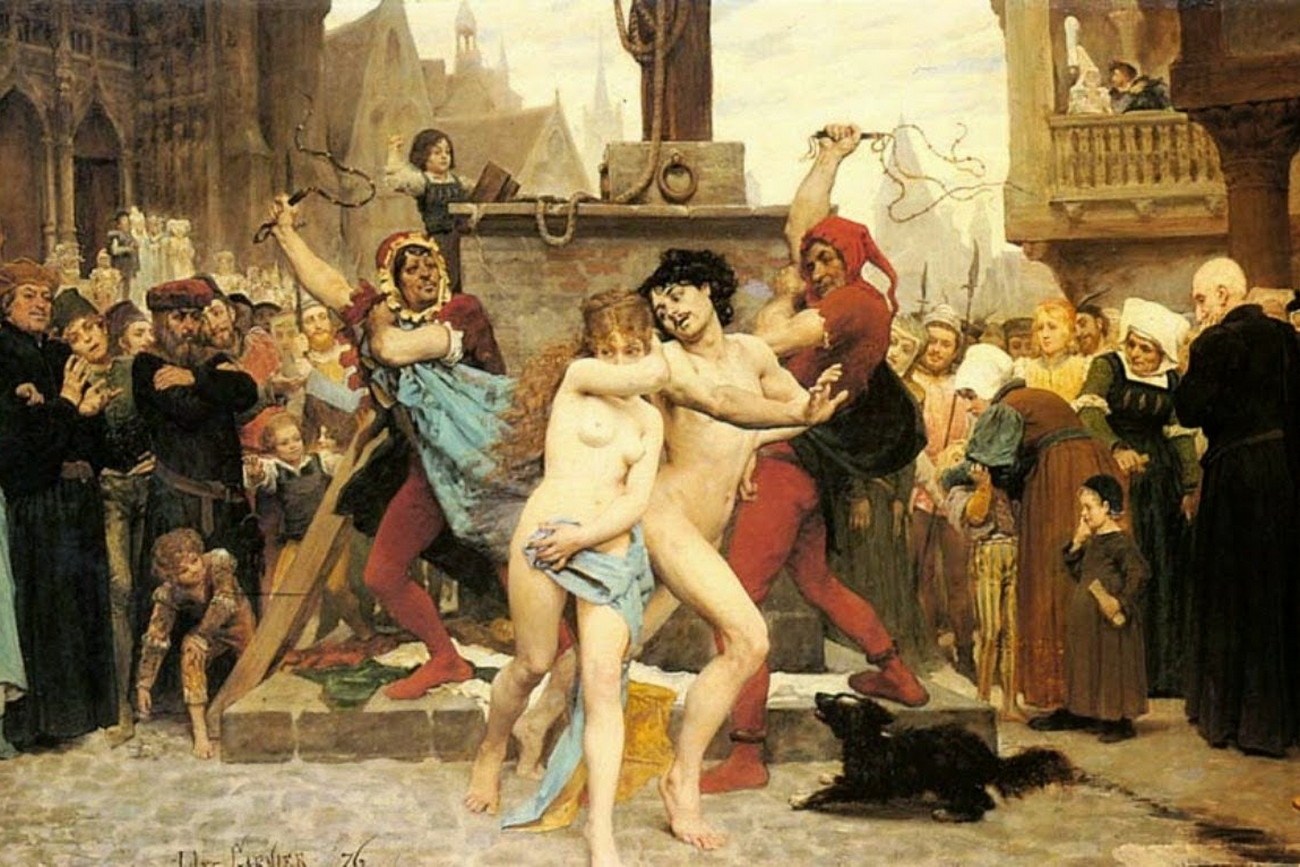 Nazí cizoložníci jsou hnáni ulicemi středověkého města, obraz od Jula Garniera z roku 1876. (ilustrace: Wikimedia Commons, PDM 1.0)