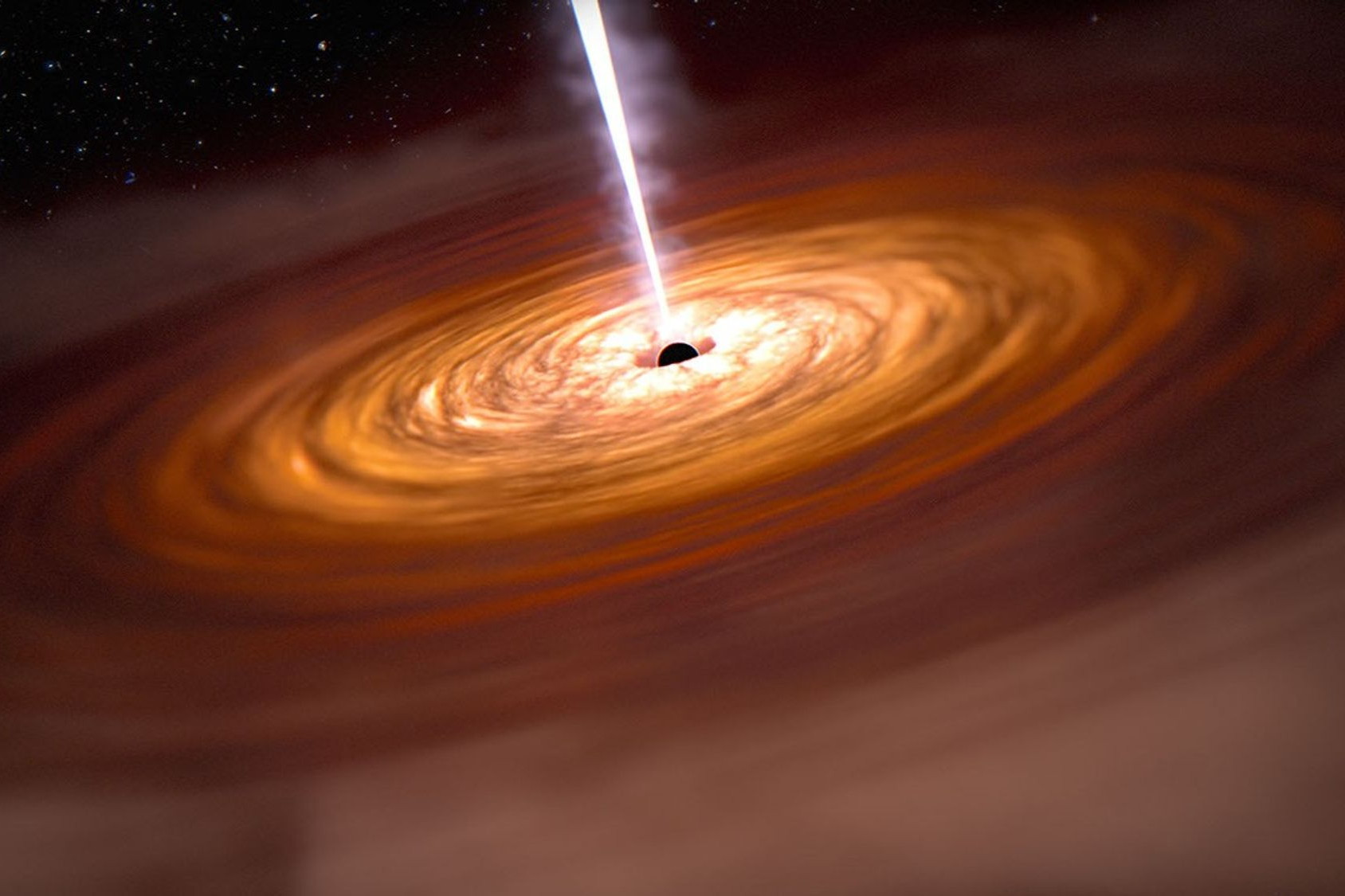 Ilustrace výtrysků z černé díry, které má na svědomí materiál z akrečního disku. (ilustrace: NASA, ESA, CSA, Joseph Olmsted, CC BY-SA 4.0)