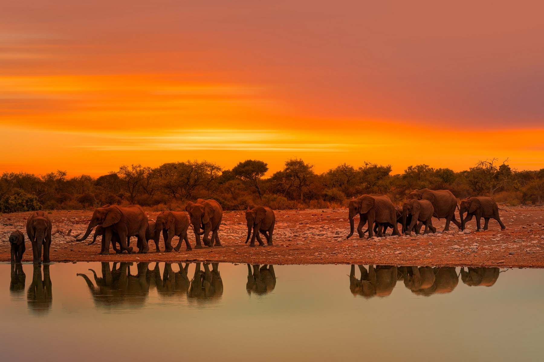 Skupina slonů stojí u jezera v národním parku Etosha.