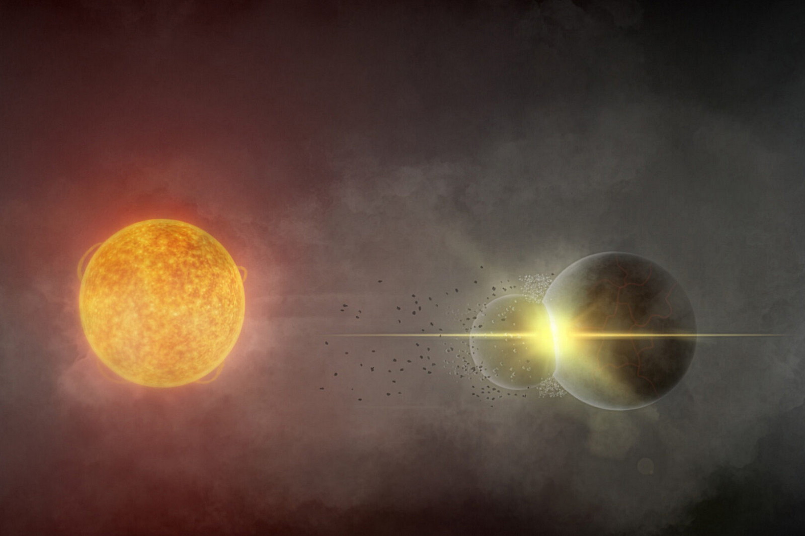 Chaotické záblesky hvězdy Gaia20ehk prozradily dramatickou událost – pravděpodobnou srážku dvou planet. (ilustrace: University of Washington, Andy Tzanidakis, CC BY-SA 4.0)