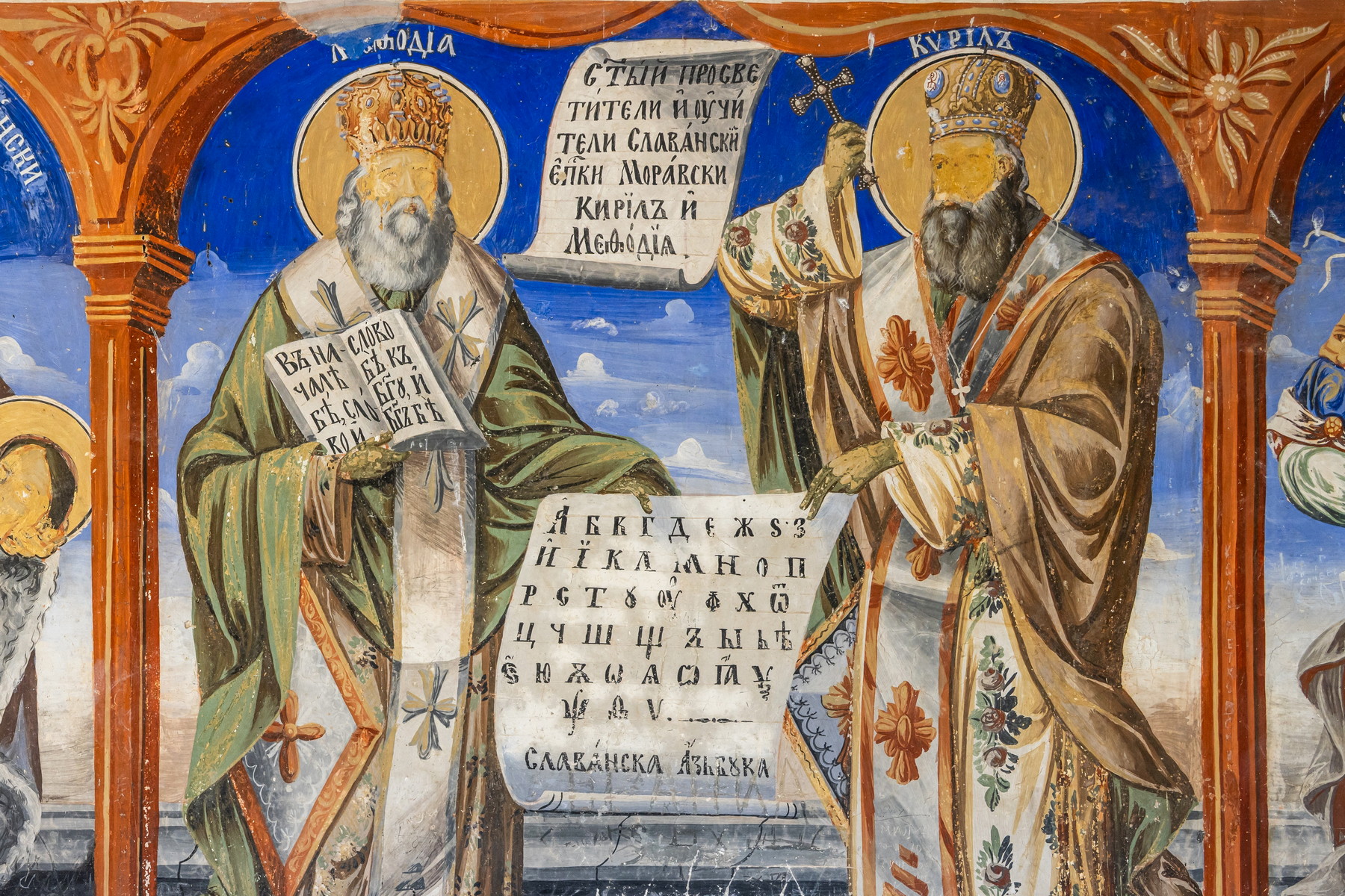 Věrozvěsti Konstantin a Metoděj na nástěnné malbě kláštera svatého Jovana Bigorskiho v Severní Makedonii. (ilustrace: Wikimedia Commons, Julian Nyča, CC BY-SA 3.0)