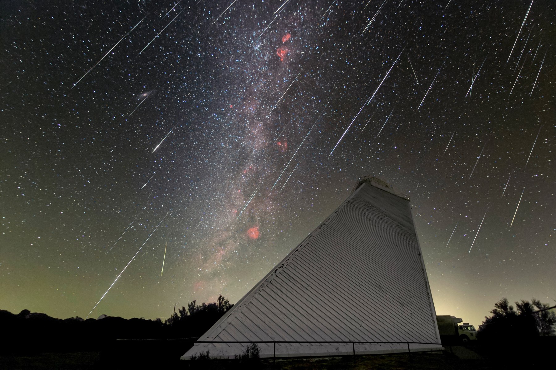 Meteorický roj Geminid nad slunečním dalekohledem NSF McMath Pierce v arizonské Národní observatoři Kitt Peak. (foto: Wikimedia Commons, KPNO, Rob Sparks, CC BY 4.0)