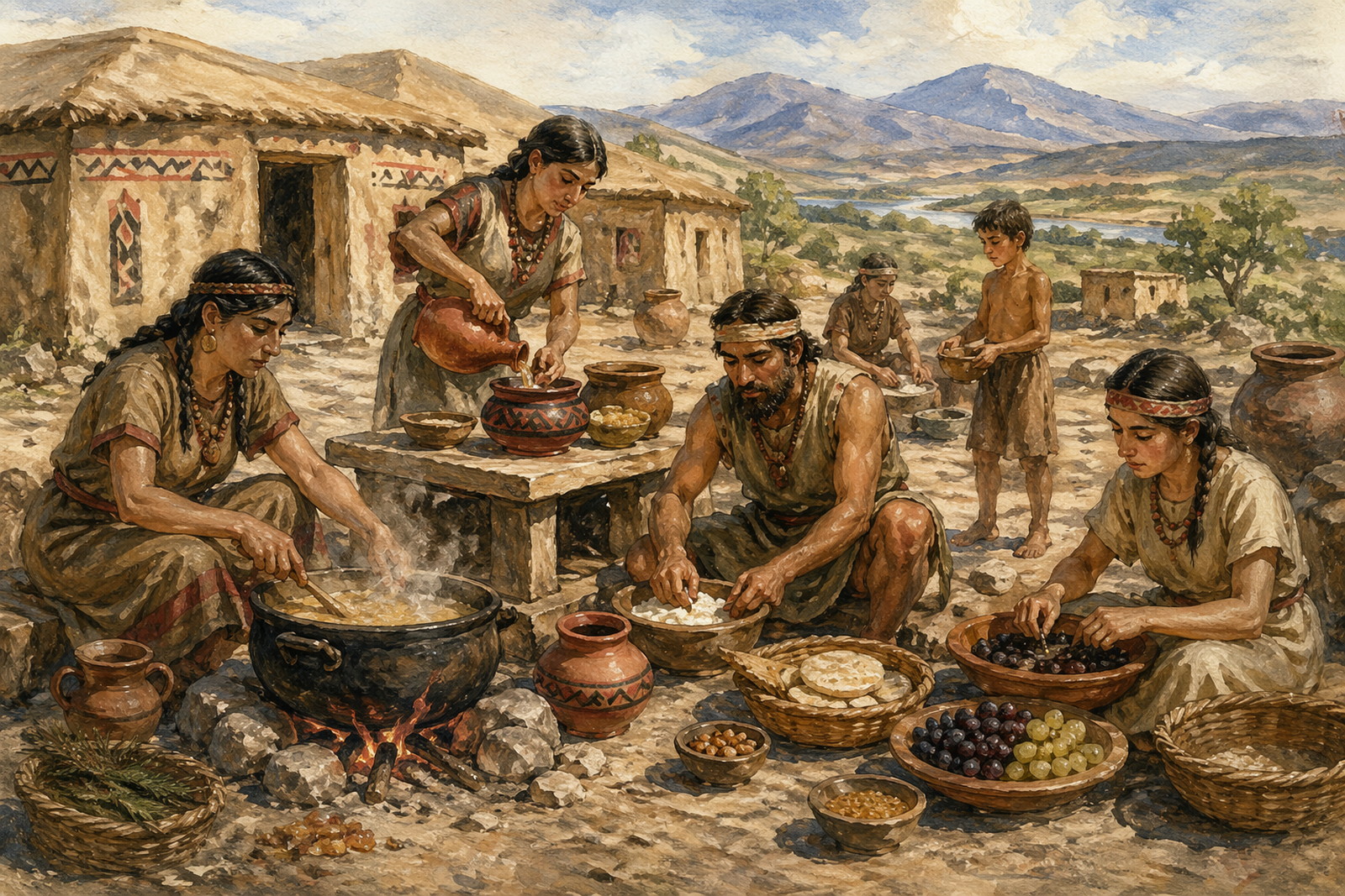 Obyvatelé kura-arakské kultury, která se rozvíjela na území dnešního jižního Kavkazu zhruba mezi 4. a 3. tisíciletím př. n. l., si dopřávali překvapivě rozmanitou kuchyni. (ilustrace: ChatGPT, PDM 1.0)