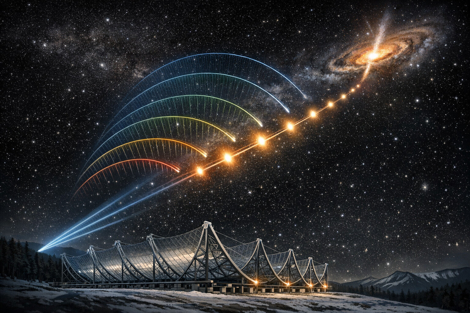 Kanadský radioteleskop CHIME pozoroval hyperaktivní zdroj opakovaných rychlých rádiových záblesků. (ilustrace: AI, PDM 1.0)