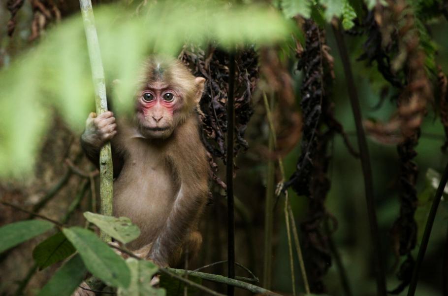 Nejprve zahlédneme samici makaka indočínského (Macaca leonina) s mládětem. Jak už jméno napovídá, má tento druh rozsáhlý areál rozšíření od Thajska a Vietnamu přes Barmu a jižní Čínu až na severovýchod Indie. V Gibbon WLS jich přežívá asi sedmdesát pět. Plížíme se po úzkých stezkách a pozorujeme, jak samice s mládětem na břiše nad námi přechází z jednoho stromu na druhý. Zastavuje se a oba se krmí ovocem.
