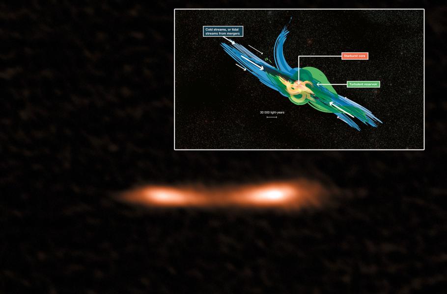 Objekt známý jako Cosmic Eyelash je vzdálenou galaxií s aktivními procesy vzniku nových hvězd, která vypadá jako dvojitá a je zjasněna efektem gravitační čočky. Kresba ve výřezu znázorňuje, jakým způsobem je plyn ve vzdálené galaxie s aktivní hvězdotvorbou dopravován do mohutných turbulentních rezervoárů chladného plynu, které se táhnou až do vzdálenosti 30 tisíc světelných let od středu galaxie.