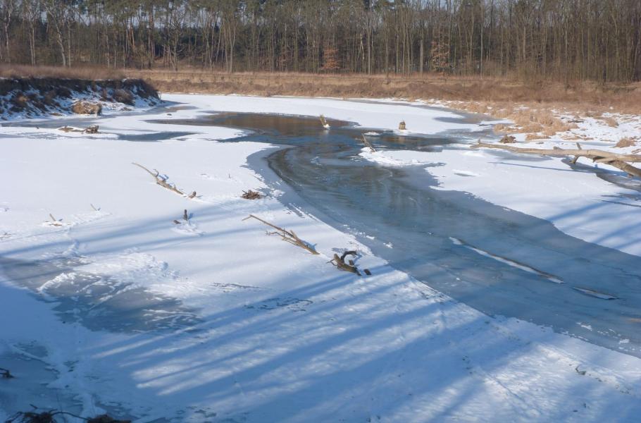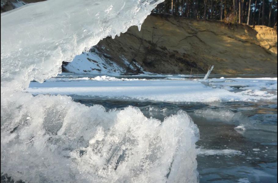Jak už bylo naznačeno, ne každou chladnější zimu řeka dočista zamrzne. Pobřežní kry se přibližují a volný průtok zužuje, až vzniknou různě dlouhé zátky, kde se hromadí tříšť a plující kusy ledu. Postupujeme skrz meandry po proudu dolů. To už hladina ztuhla od břehu ke břehu a na ledu počítáme první hroudy, první pozdrav glaciálu. Hliněné břehy mrazem praskají a rozpadají se v celých blocích. Panenské pobřeží v třeskuté zimě evokuje krutou mrazivou éru, kdy se zdejší navátá krajina formovala. Cesta po ledu podél strmých břehů je skutečně tak trochu návratem do ledových dob. Ledové čelisti se zakousnou i do písečných stěn, každou chvíli se odlamují další kusy zmrzlé hlíny a na led se sype i mrazem stržený písek. Chybí jen huňatá glaciální fauna a pračlověk.