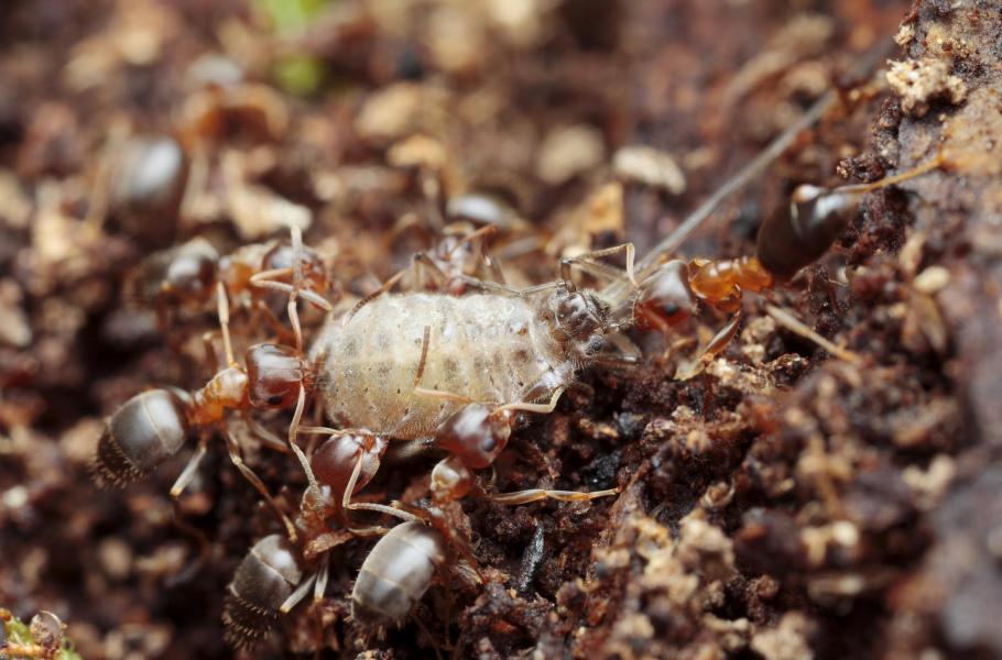 Malé skupinky nosálek se krčily v přítmí hnízda a mravenci kolem nich stále vzrušeně pobíhali. Čas od času některá nosálka vyprodukovala kuličku sladké tekutiny (medovice), kterou mravenci ochotně sbírali. Tomuto vztahu mezi mravenci a mšicemi, kdy mravenci poskytují mšicím ochranu a ty jim na oplátku dávají sladkou medovici, se říká trofobióza.
