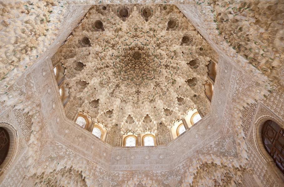 Úchvatný Salón de los Embajadores se tyčí do výšky osmnácti metrů a vyplňují ho dokonale vybroušené ornamenty s přírodními motivy. Umělecké formy vrcholného islámu totiž zakazovaly zobrazování postav, a jejich místo tak zaujaly geometrické linie. Klenbu tudíž zdobí nesčetné „muqarnas“ – výčnělky připomínající stalaktity ze zpevněné sádry, jež lze kombinovat do složitých podob.