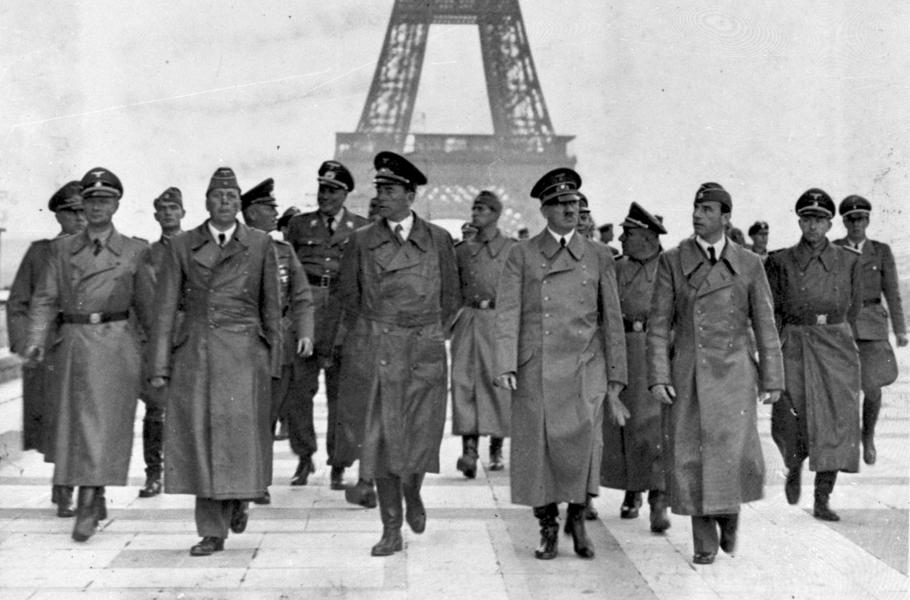 Nacističtí pohlaváři v Paříži v červnu 1940 – (zleva) Karl Wolff, Hermann Giesler, Wilhelm Keitel, Wilhelm Brückner, Albert Speer, Adolf Hitler, Martin Bormann, Arno Breker a Otto Dietrich. (foto: Wikimedia Commons, Bundesarchiv/Heinrich Hoffmann, CC-BY-SA 3.0)