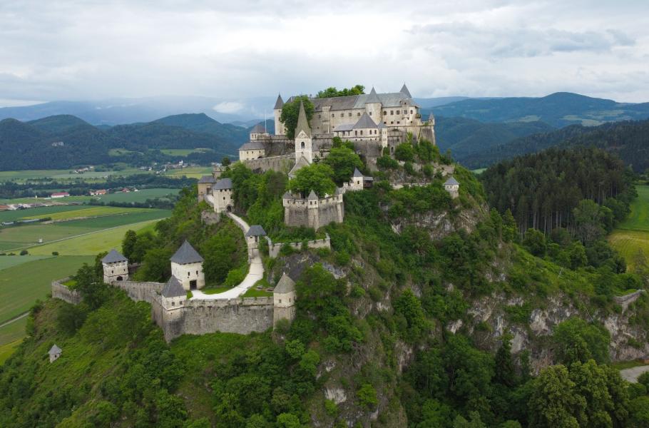 Pro vybudování obranné pevnosti si nejstarší příslušníci šlechtického rodu Khevenhüllerů, kteří sídlo vlastní dodnes, nemohli vybrat lépe: Z ploché krajiny se tyčí 150 metrů vysoký kopec, jenž skýtá ideální rozhled do okolí a zároveň tvoří přirozenou bariéru pro potenciální vetřelce. S cílem zkomplikovat jim přístup také později vzniklo čtrnáct opevněných bran. V 16. století je nechal vystavět korutanský hejtman George Khevenhüller, první majitel z uvedeného rodu, který nemovitost odkoupil od císaře Fridricha III. Habsburského.