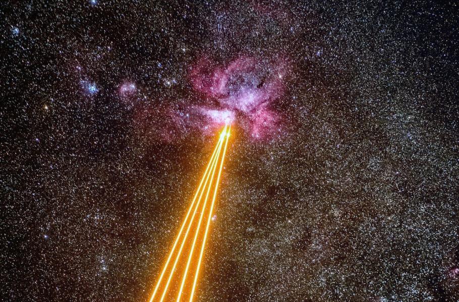Čtyři jasně oranžové laserové paprsky protínají noční oblohu a směřují k velké, jasné a fascinující mlhovině Carina, v souhvězdí Lodního kýlu. Právě tady se mimo jiné nachází populární Eta Carinae, extrémní soustava minimálně dvou hvězd, kde v budoucnu exploduje supernova či hypernova. Jako by Země s touto mlhovinou vedla duel laserovými zbraněmi. Naštěstí, Carina nejspíš neodpoví, už jenom proto, že světlo k ní letí zhruba 7 500 let.