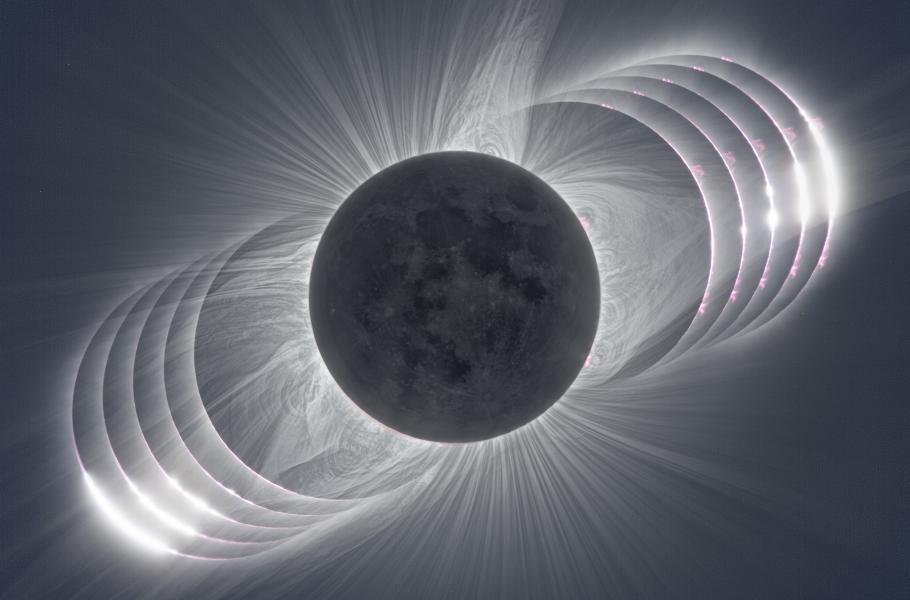 Koláž zachycuje průběh úplného zatmění Slunce (zleva doprava). Uprostřed je patrná i tvář Měsíce, díky jevu nazývanému „popelavý svit“, zatímco zakrytý disk hvězdy obklopuje paprskovitá koróna. Na začátku a na konci úkazu jsou vidět oslnivé kapičky slunečního světla a také narůžovělá obálka stálice, tzv. chromosféra.