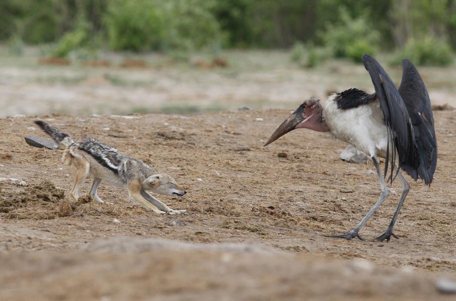 Několikrát jsem měl možnost pozorovat šakaly u sloní mršiny. Obrovské tělo většinou poskytuje dostatek potravy všem zvířatům, která se na něm živí. Přesto tady panuje určitá hierarchie. Jako první většinou žerou největší zvířata a teprve až se nasytí, přicházejí na řadu ti menší. Šakal je malá šelma, a tak ho od žrádla může odehnat i hejno supů nebo několik čápů marabu.