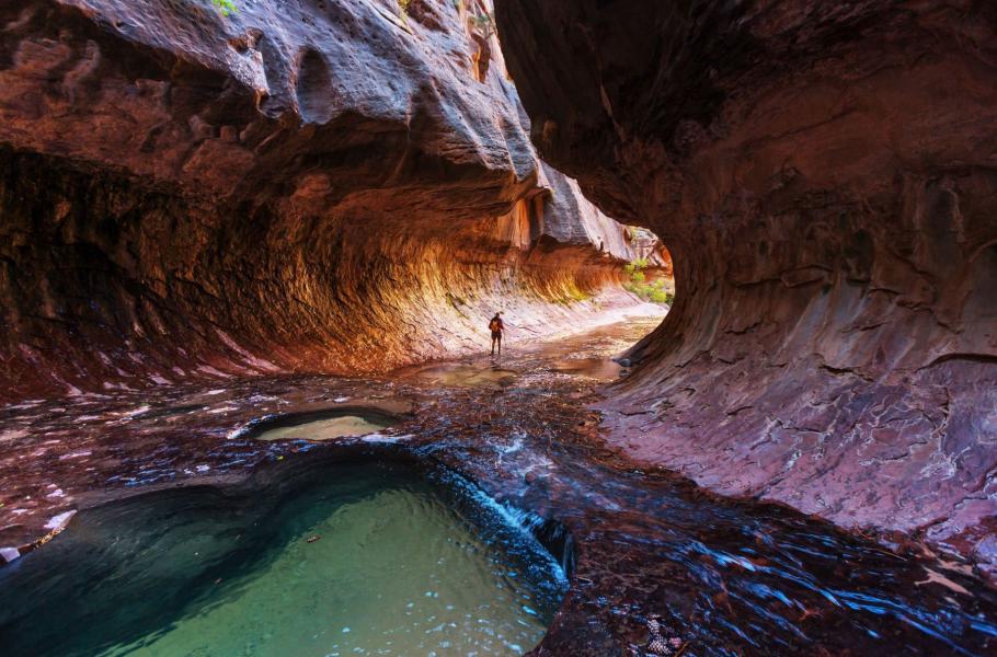 Puklinový kaňon nazvaný Subway patří k nejvyhlášenějším místům Národního parku Zion. Abyste ovšem tato místa viděli na vlastní oči, potřebujete 50 metrů dlouhý provaz pro slaňování a nesmí vás odradit ani hluboká studená voda