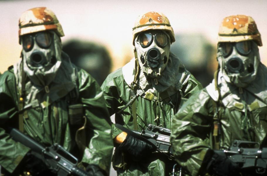 Že aklimatizace na odlišné podnebí představuje důležitý proces ovlivńující bojeschopnost vojáka, potvrzuje tento snímek pořízené během války v Perském zálivu v dubnu 1991. Tři vojáci od 82. výsadkářské divize chodí okolo svého tábora v Saúdské Arábii v nepromokavých pláštích, plynových maskách a rukavicích, aby se jejich tělo rychleji přizpůsobila horkému pouštnímu podnebí.