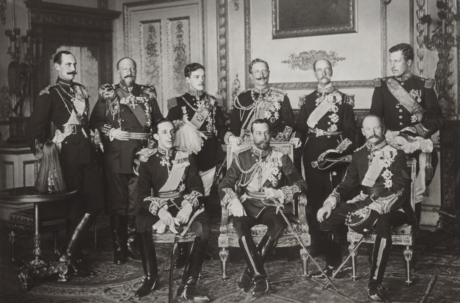Evropští panovníci v roce 1910. Většina příbuzní, přesto proti sobě později pozvedli zbraně. Vilém II. stojí třetí zprava, uprostřed sedí Jiří V. (foto: Wikimedia Commons, W. & D. Downey, CC0)