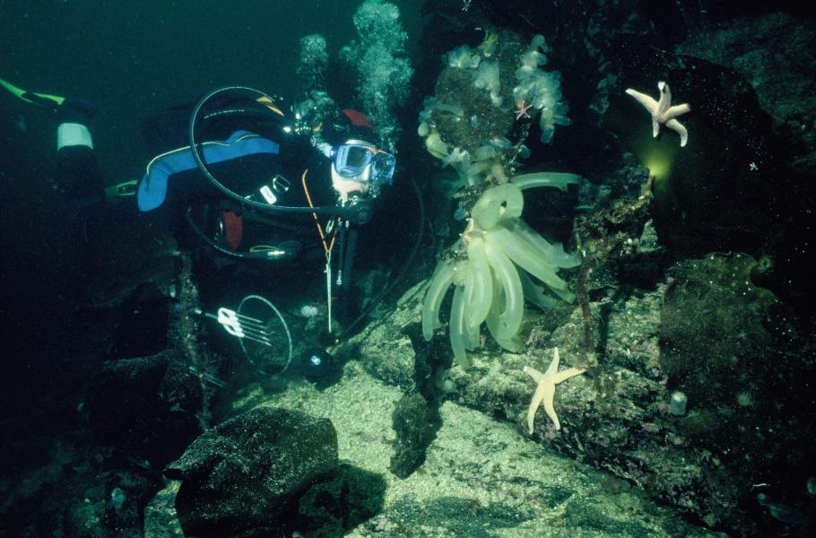 Šerý a nevlídný vodní prostor je s přibývajícími metry hloubky stále temnější. Oči se při panujících světelných podmínkách nemají čeho zachytit, a tak sledují aspoň kotevní lano. Viditelnost dosahuje stěží šest metrů. V temnotě pod námi se konečně cosi mění a oči začínají vnímat náznaky pohybu – stvoly chaluh laminarií přichycených k balvanitému dnu v hloubce 25 metrů vlají v proudu téměř vodorovně.