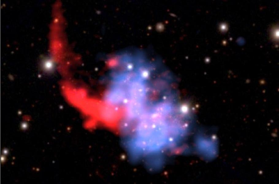 Není to jako srážka dvou automobilů. Kupy galaxií se srážejí velmi pozvolna, v průběhu dlouhých milionů let. Když se kupy galaxií srazí, dochází mimo jiné i k urychlení elektronů, které se nacházejí v oblastech kontaktu, na rychlosti velmi blízké rychlosti světla. Když pak tyto extrémně urychlené elektrony narazí na magnetická pole prostupující kupy galaxií, dojde k vyzařování rádiových vln.