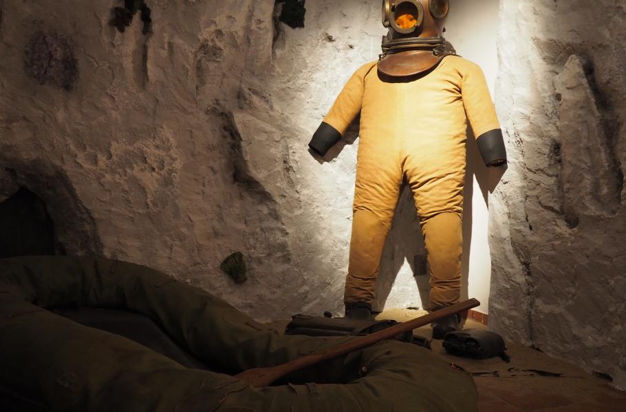 Počátek minulého století přál dobrodruhům a Karla Absolona bychom mezi ně mohli určitě počítat. V roce 1921 zahájil se svým týmem výzkum v macošských jezírcích a poté i v říčce Punkvě. Ke svému bádání se rozhodl využít veškeré vymoženosti, které tehdejší doba nabízela, a tak se mezi tím vším důležitým haraburdím objevil i potápěčský skafandr.