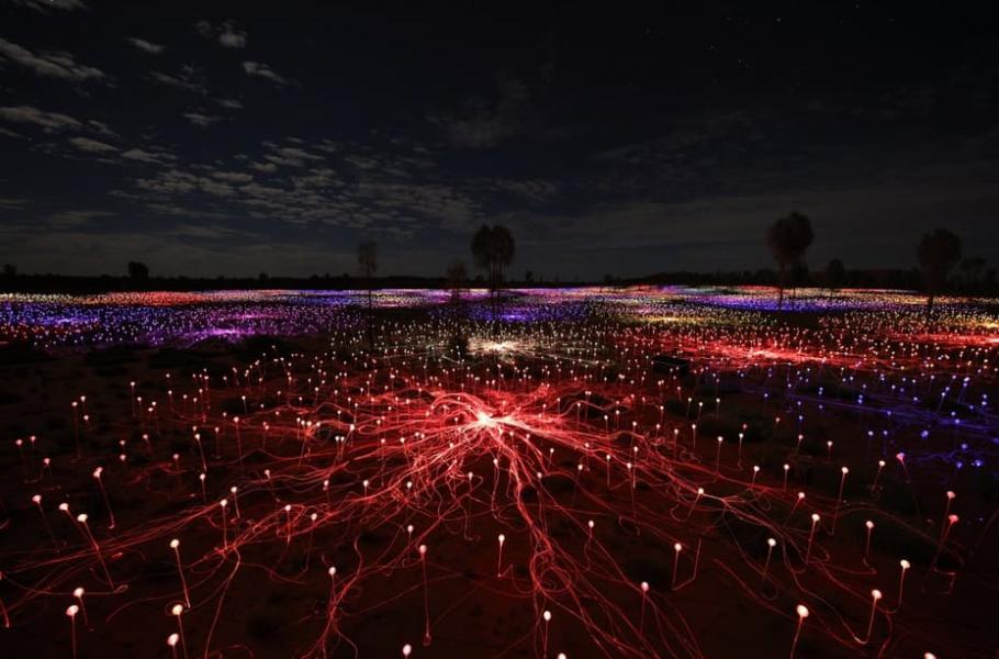 Bruce Munro z Velké Británie se rozhodl, že nechá „rozkvést“ noční poušť v australském Národním parku Uluru, ležícího v blízkosti slavné rudé skály Ayers Rock. Svou uměleckou instalaci nazval Field of Light (česky Plocha světel).